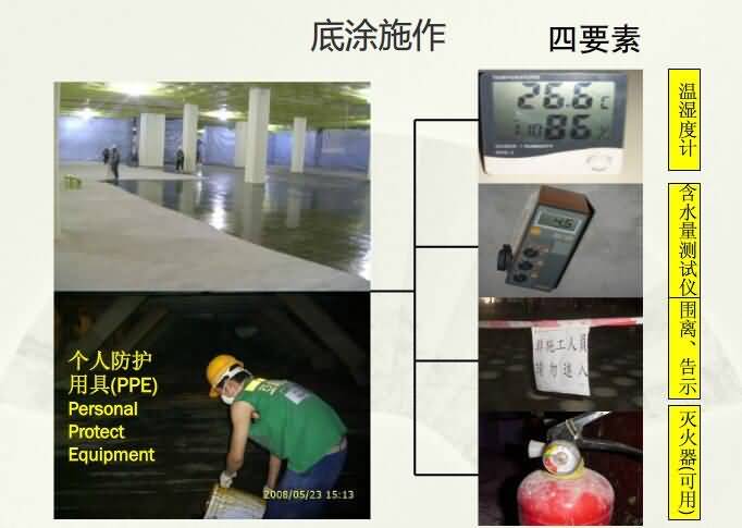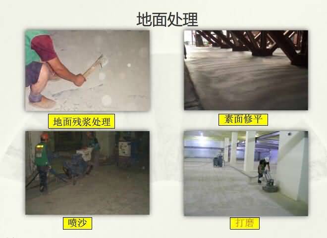 1.素地處理:①基礎(chǔ)素地以水泥粉光面或磨石地為準(zhǔn);②素地需養(yǎng)生28天以上,水份需8%以下方可施工素地如有不平或空鼓需加以除去;③用環(huán)氧砂漿補(bǔ)平地面;④素地之油污需澈底清洗干凈;⑤施工前需保持施工素地之干燥和清潔;