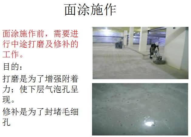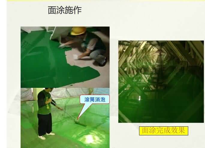 5.面涂層:①施工前需保持干凈如有雜物粘附需清除;②使用前主劑先攪拌均勻;③依照正確比例將主劑及硬化劑混合,充分?jǐn)嚢?④使用滾筒或鏝刀將材料均勻涂布混合完成材料需30分鐘以內(nèi)施工完成;⑤施工交接處需做好交接處理;⑥施工完成后,24小時(shí)后方可上人,7天后方可重壓(以250C為準(zhǔn),低溫時(shí)開(kāi)放時(shí)間需適度延長(zhǎng))。