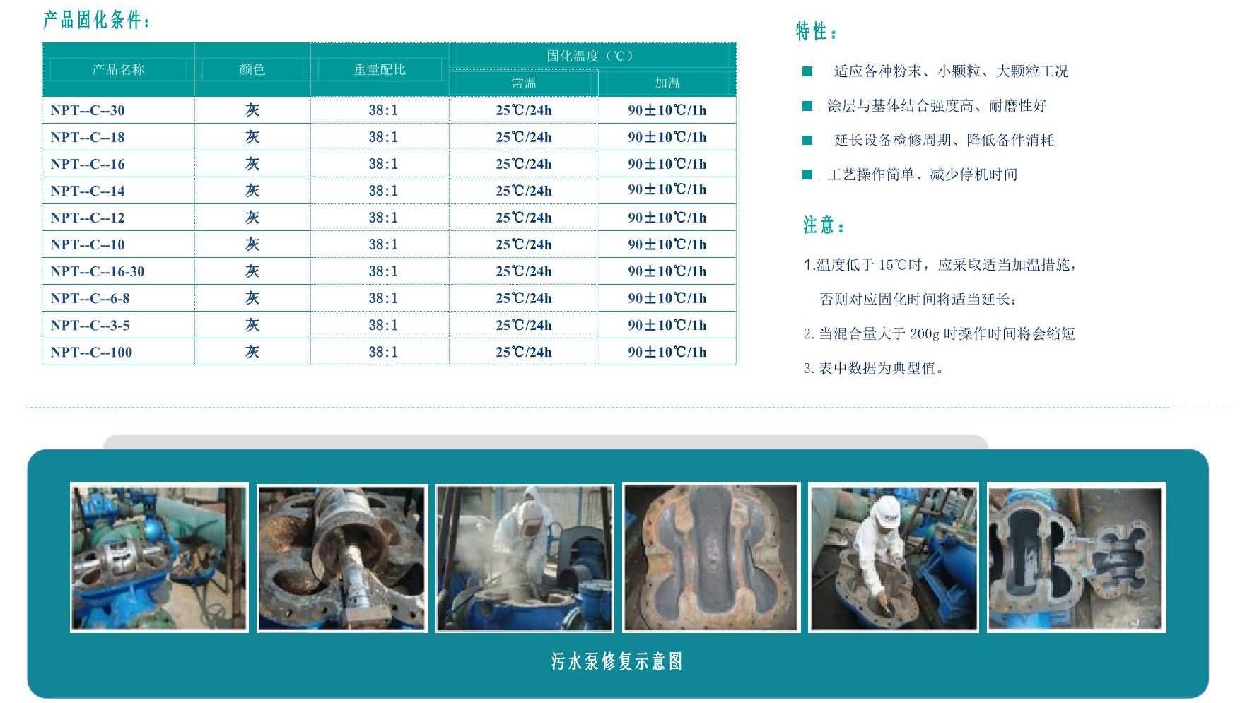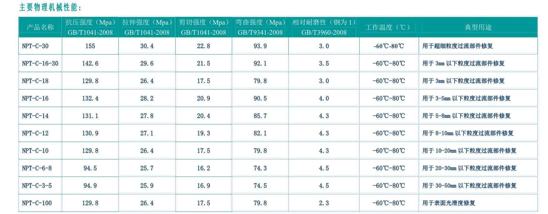 雙組分,以陶瓷、金屬碳化物、微型顆粒為骨材的耐磨復(fù)合材料,具有耐水、耐油、耐酸堿性。適用于(工作溫度在-60℃~80℃)設(shè)備過流沖蝕、設(shè)備的大面積修復(fù)、設(shè)備預(yù)涂耐磨層,如旋流器、浮選柱、浮選機(jī)、泡沫槽、分級(jí)機(jī)、攪拌桶、溜槽、管件類、泵類等修復(fù)(典型用途見主要物理機(jī)械性能表)。
