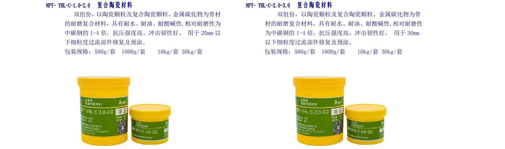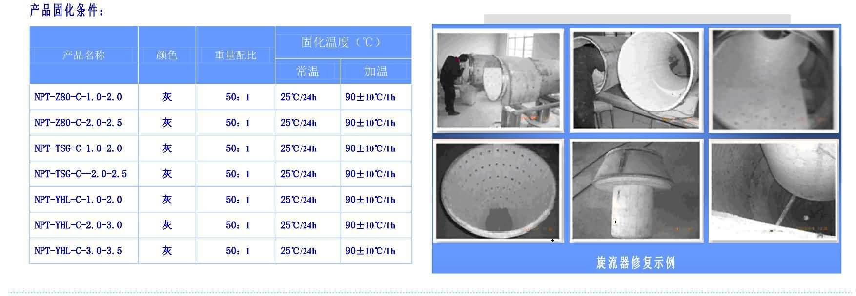 NPT-常溫復合耐磨材料雙組分,以陶瓷顆粒及復合陶瓷顆粒、金屬碳化物為骨材與PDMG預聚體為基礎(chǔ)的耐磨復合材料,具有耐水、耐油、耐酸堿性。適用(-60℃-80℃)設(shè)備過流沖蝕、設(shè)備的大面積修復、設(shè)備預涂耐磨層,如旋流器、浮選柱、浮選機、泡沫槽、分級機、攪拌桶、溜槽、管件類、泵類等修復(典型用途見主要物理機械性能表)。